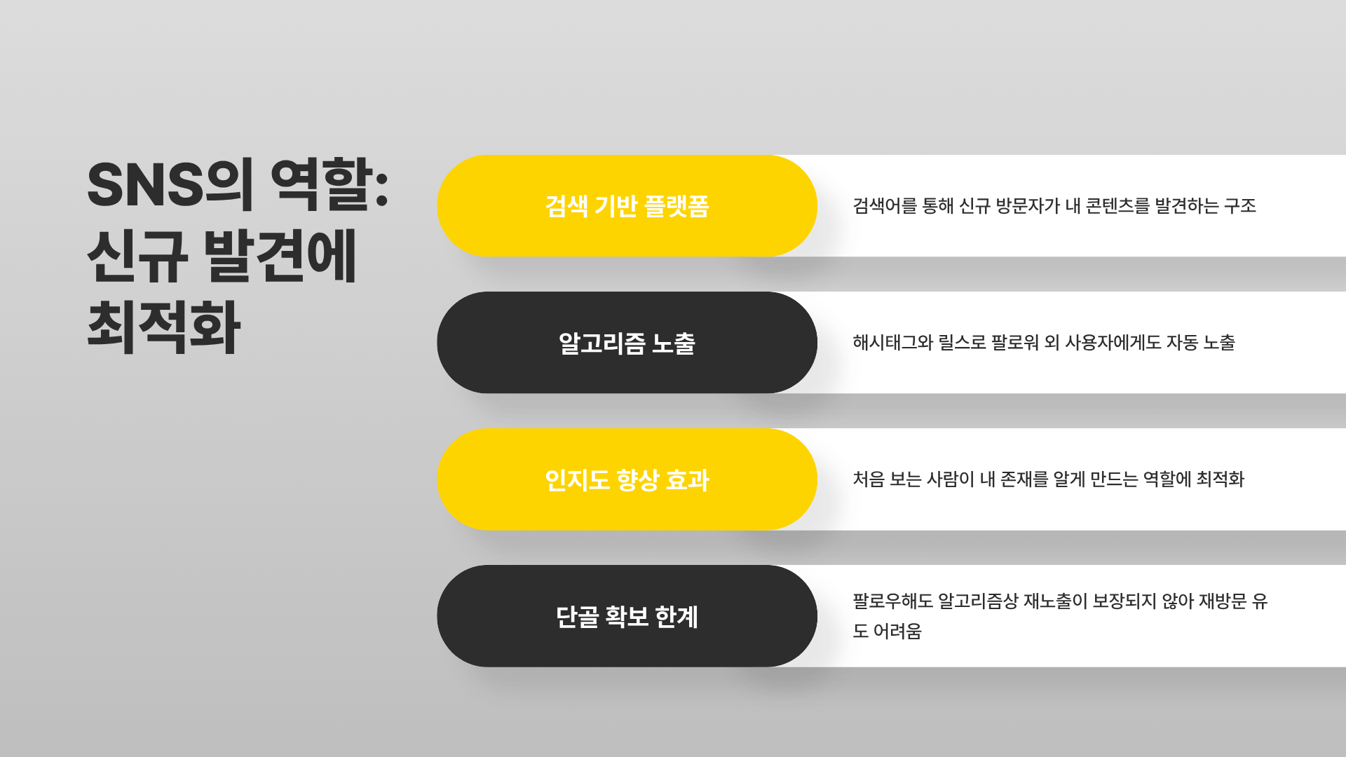 이처럼 SNS는 '신규 발견'에 최적화된 구조입니다.