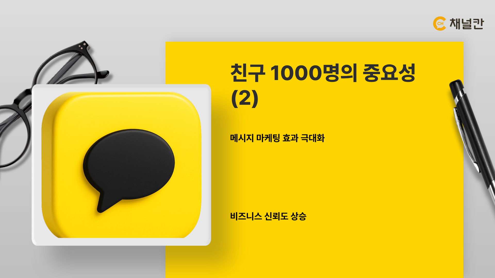 친구 100명에게 이벤트 메시지를 보내는 것과 1,000명에게 보내는 건 10배 차이입니다. 같은 노력으로 10배의 결과를 얻는 거죠. 친구 수가 곧 마케팅 자산입니다.