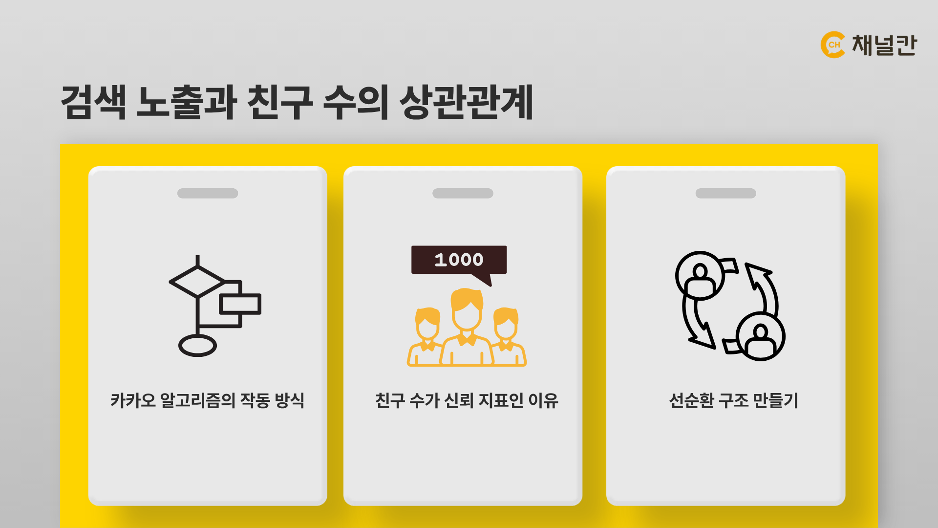 카카오 알고리즘이 "친구 수"를 신뢰 지표로 활용하기 때문입니다. 친구가 많다는 건 그만큼 많은 사람들이 이 채널을 인정했다는 의미니까요.